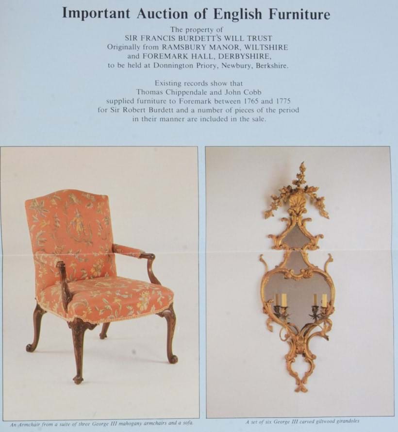 May 1986: An Important Auction of English Furniture, the property of Sir Francis Burdett's Will Trust: the auction promotion states that 'Existing records show that Thomas Chippendale and Thomas Cobb supplied furniture to Foremark Hall between 1765 and 1775 for Sir Robert Burdett and a number of pieces of the period in their manner are included in the sale'. The auction realises over £½m, with the top lot a set of six George III carved giltwood girandoles which sells for £90,000. The firm had a long history of providing valuations for the Burdett family and as the Daily Telegraph noted, Donnington Priory, '... enabled them to show the 135 lots in a setting worthy of them.'