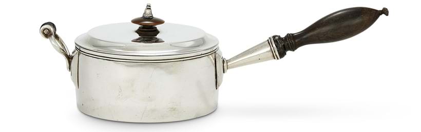 In addition to these two basic categories of silver are pieces in the English taste, but which were designed to fulfil the specific requirements of Anglo-Indian social life. These items include milk and butter coolers (Lot 59), obviously necessary in the intense heat; covered goblets and beakers (Lots 86 & 91), which kept insects from spoiling one’s libation; rice bowls; saucepans which transform themselves into serving dishes by means of detachable horn handles (Lot 55); and salts and peppers in a form that fits snugly into a servant’s sash, as everyone travelled not only with his own retainers, but his own personal seasoning as well. As a certain Mrs. Fay observed in her Letters from India of 1780,