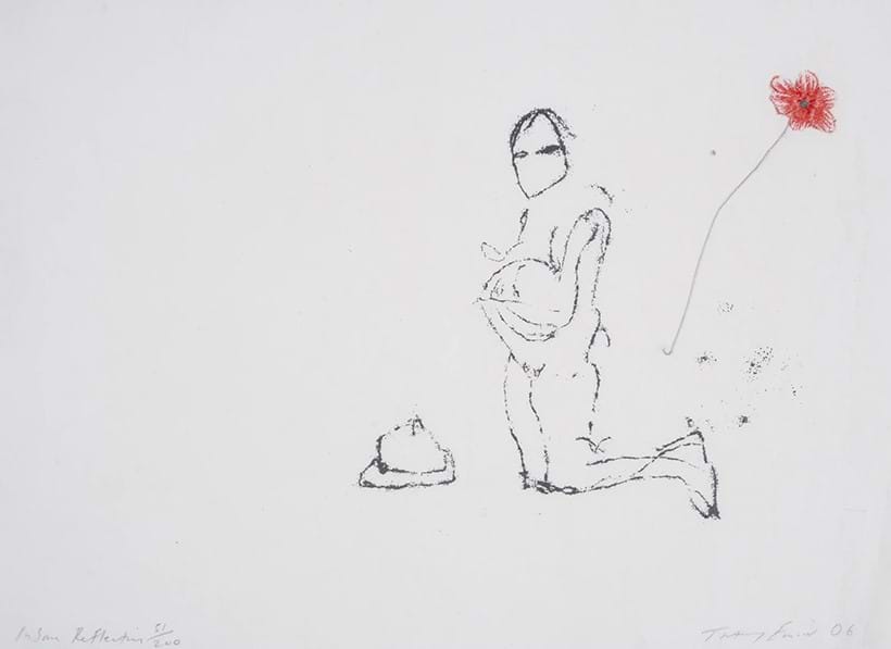 Known for creating works conveying experiences and events from her life, she uses a range of media including drawings, tapestries, embroidery, film, bronze sculptures, neon signs and wooden constructions. Personal monologue is an important thread within her work, and commonly her works are sexually provocative, their narratives have a raw openness that has often sparked debate amongst her viewers. Emin draws on her own experience and her introspection is clear in the works offered in the auction, she invites us into her world with playful titles and honest, even crude, self-portraiture with her works, ‘When I think About Sex’ (Lot 16), ‘Love Is What You Want’ (Lot 19), ‘Tracey X Tracey’ (Lot 14) and ‘Insane Reflection’ (Lot 17).