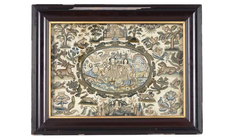 To start the auction, we will be offering a wonderful Charles II embroidered stumpwork panel (Lot 1). Dating from the 17th century, it is finely embroidered in colour silks and metal threads. The work depicts a noble family, beneath a mansion, with a mermaid bathing amongst sea creatures in a watery grotto above. These are surrounded by flowers, domestic and wild beasts, birds and insects.
