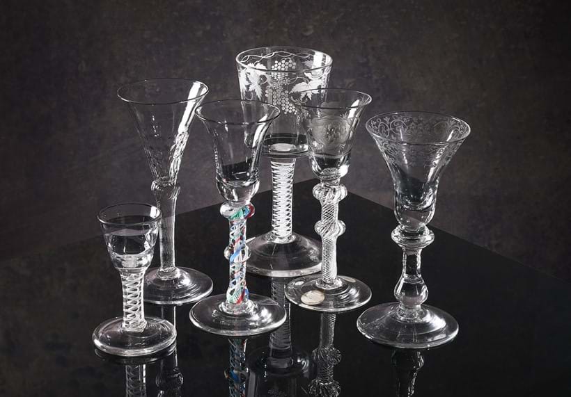 The popularity for collecting of 18th century English drinking glasses remains strong in today's market. We are pleased to be offering a wonderful range of antique wine glasses, dating from the 18th century in different styles and decorations. These come to auction from a private Gloucestershire collection and previously with the likes of Jeanette Hayhurst and Tony Werneke.
