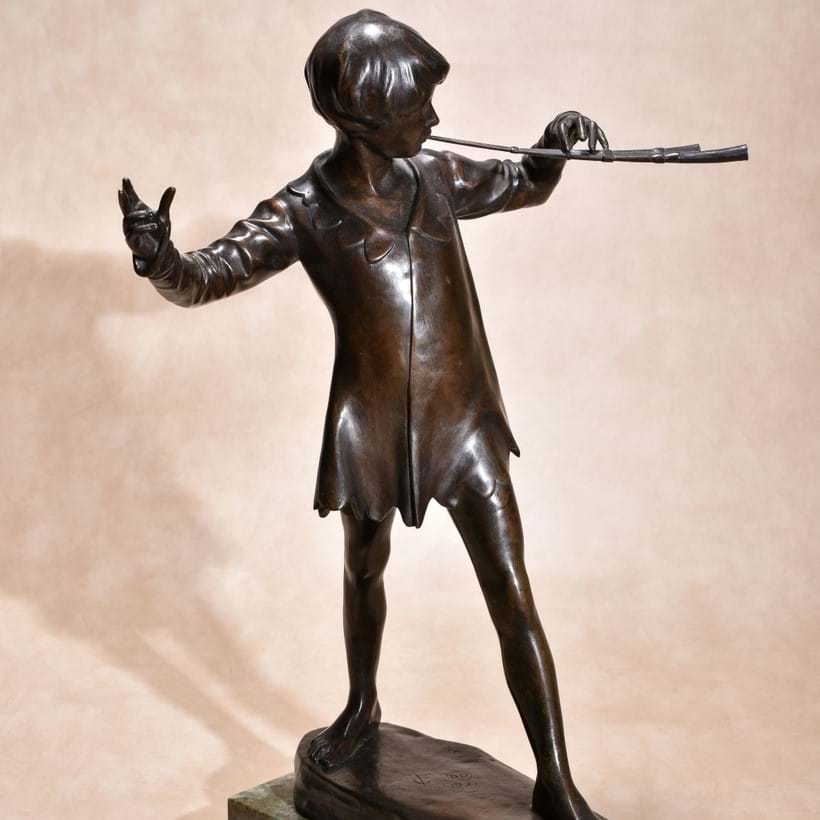This charming bronze is after J.M. Barrie’s original commission located in Kensington Gardens. Sir George Frampton trained originally as an architect before studying sculpture at Lambeth School of Art and later at the Royal Academy Schools. He was a central figure in the New Sculpture movement whose ethos rejected classical prototypes in favour of new allegorical figures chosen to express abstract ideas about the human condition. Frampton received many honours and commissions for public monuments, notably Queen Victoria, Queen Mary and the Edith Cavell Memorial, 1920.
