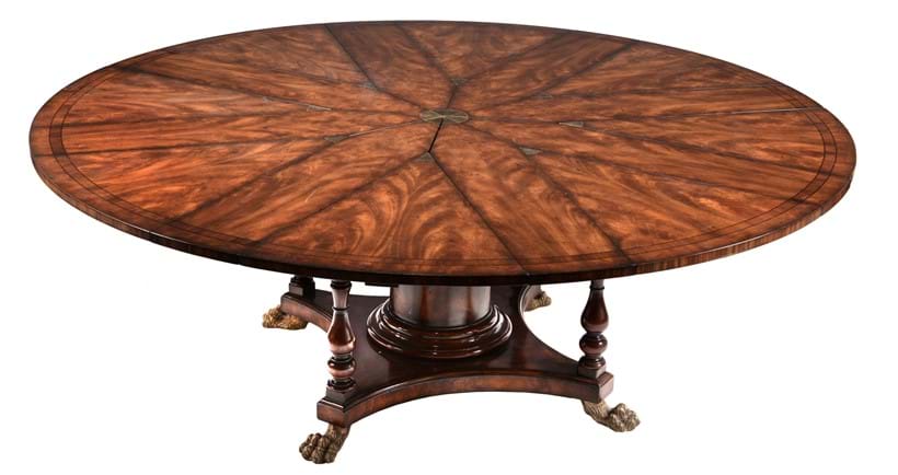 Another highlight from this private collection is Lot 36, a flame mahogany extending dining table after the pattern by Robert Jupe. The patent was first granted in March 1835 and the originals produced by the firm of John Johnstone of New Bond Street. It is ingeniously designed with a top which incorporates a capstan action which allows it to open concentrically for the insertion of the eight leaves. It comes with a bespoke cabinet to hold the leaves and is designed to stand proudly at the side of the room.
