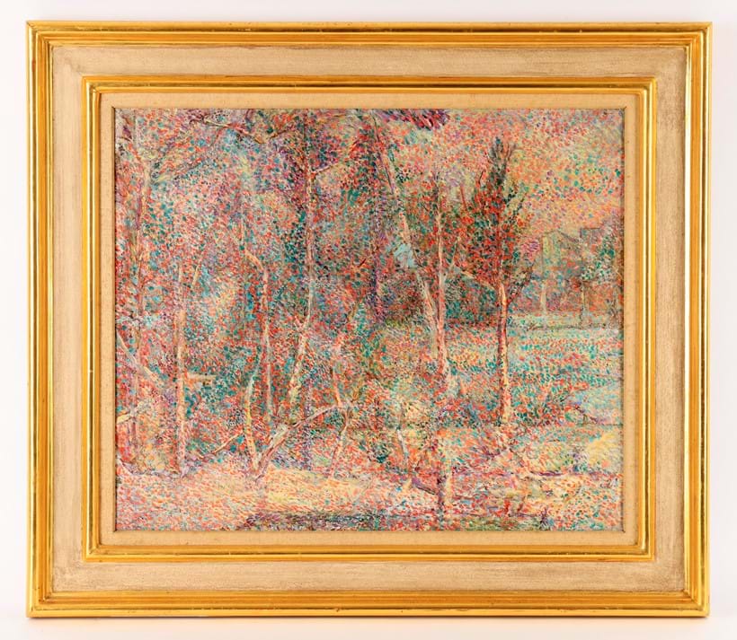 Elliot Seabrooke was born in Upton Park, Essex in 1886. Seabrooke went on to study at the Slade School of Fine Art between 1906-1911 with Henry Tonks. Seabrooke paid a small fee to rent a studio in Westmorland which he used as a base to produce his works, mainly studying the landscape. During World War I Seabrooke served in the British Red Cross and was an Official War Artist on the Italian front. Seabrooke, also had aspiration to become an actor and worked with people such as John Gielgud, Wendy Hiller and Ralph Richardson. Seabrooke’s first solo exhibition was held at the Carfax Gallery, London in 1912. Works are held in the collection of some of the United Kingdom’s most prestigious galleries including the Tate Gallery and the Imperial War Museum. This particular work, Lot 140, is beautiful executed using a pointillist effect. The soft sheen on the trunks of the silver birches appears through the detailed build-up of colour creating a beautiful hazy effect.