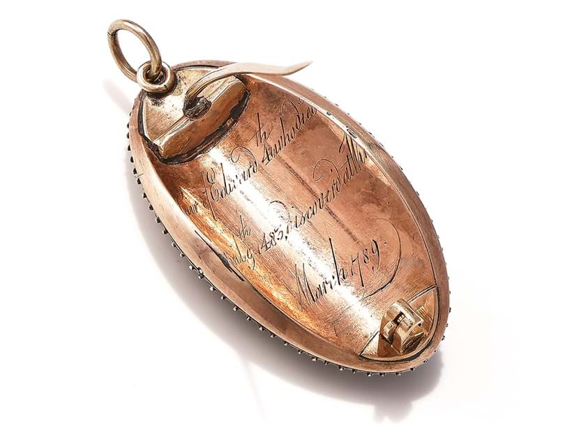 Interest in Memento Mori jewellery grew toward the end of the Medieval and Tudor periods and continued into the Georgian era. The phrase "Memento Mori" loosely translates to "remember you must die," and these pieces were often adorned with skulls and symbols of mortality, like hourglasses and sickles, to reflect life's fleeting nature. During the Stuart and Georgian periods, this macabre style evolved into more ornate and sentimental forms, incorporating symbols such as funerary urns and weeping willow trees. Other motifs included clasped hands and hearts symbolizing love and unity with the deceased. White enamel was commonly used to honour an unmarried woman or child. Pearls were often used to symbolise tears, especially in remembrance of young children. This trend surged in popularity during the Victorian era.