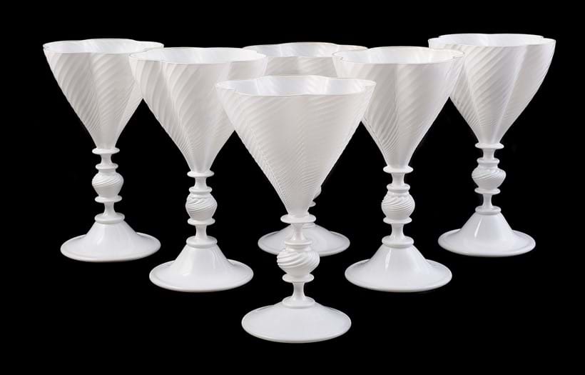 Lot 295: A group of twenty four opaque white cased clear glass goblets, specially commissioned from Boutique Talmaris, Paris | Est. £200-300 (+ fees)