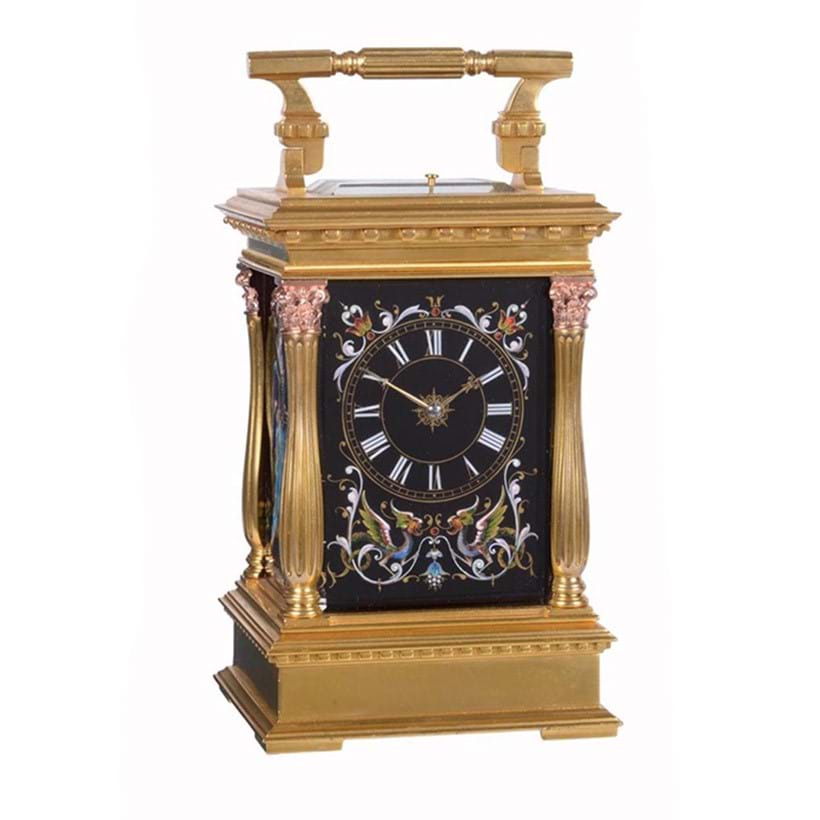 Lot 99 is a fine example of a grande-sonnerie striking carriage clock by French maker Pierre Drocourt. Built in the late 19th century, the clock is housed in a fine gilt brass oval case with intricate engravings befitting a piece destined to be retailed by Tiffany and Co.
