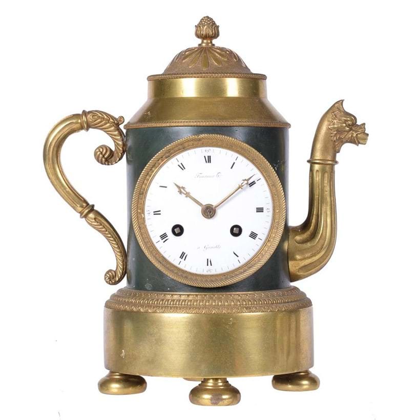 Lot 145 is an extraordinarily rare mantel clock by the Grenoble-based clockmaking family Fournier.