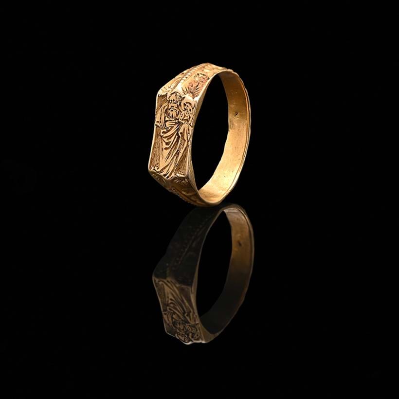 A fascinating highlight within the sale is this early 15th century iconographic gold ring, depicting St John the Baptist, circa 1430. The slightly fluted bezel with shaped ends is incised with the figure of St John the Baptist wearing a heavy cloak and pointing to the lamb, with engraved sunburst shoulders and a floral engraved shank with diagonal beaded detail.