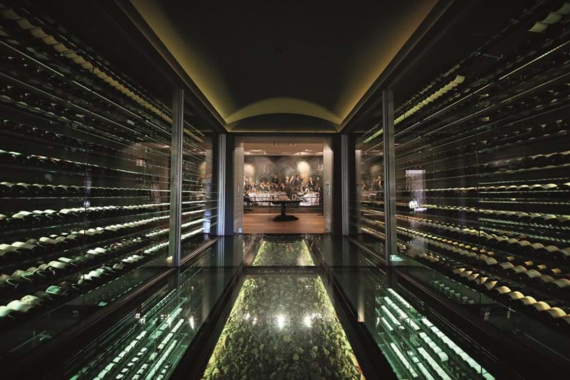 On entering The Vineyard it is hard not to be immediately impressed by the monumental Henry Moore bronze sculpture that sits in the entrance hall. There is a couple sat sipping coffee and reading the morning newspaper in front of a roaring fire beside a charming painting by George Clausen. Just beyond the entrance is the Wine Vault, a glass walkway, housing just some of the wine collection on offer to all guests, which leads to an events room with a captivating mural which combines Sir Michael’s two biggest passions, wine and art – also shared by those at Dreweatts.